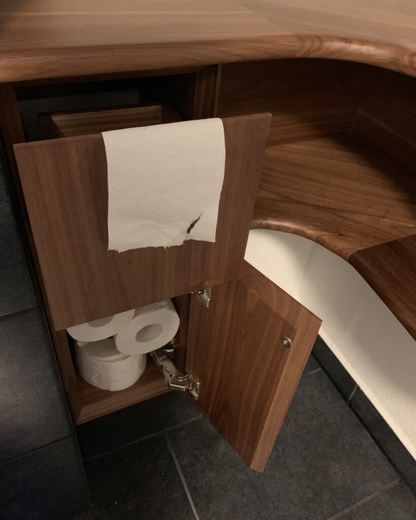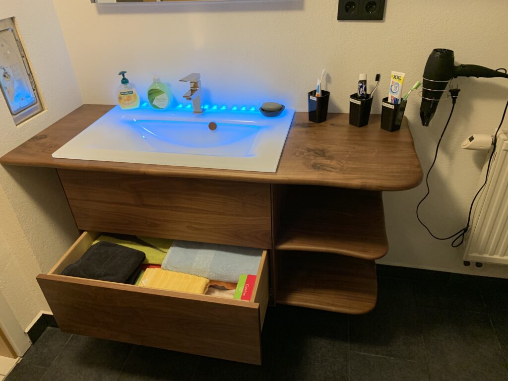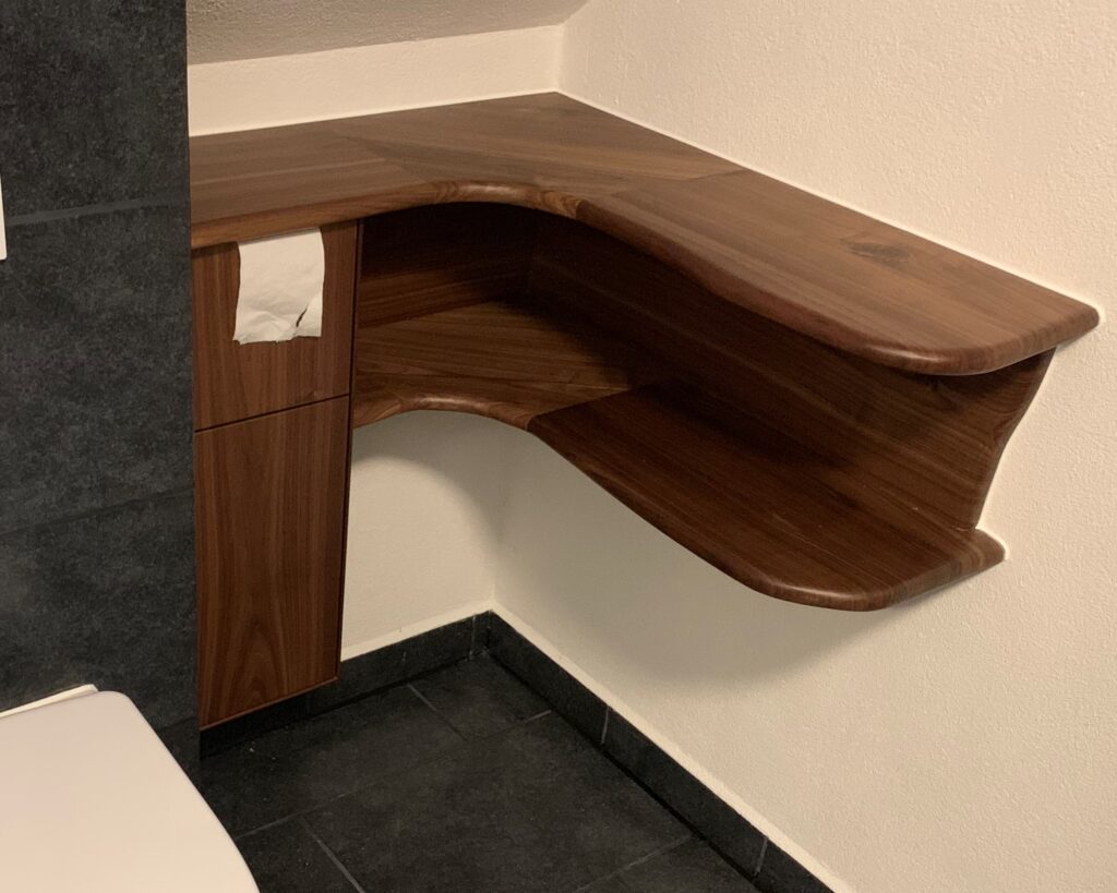 Badezimmer Waschtisch aus Nussbaum mit beleuchtetem Glaswaschbecken. Kleine Ablage im Eck mit Klopapierhalter und Lagerplatz