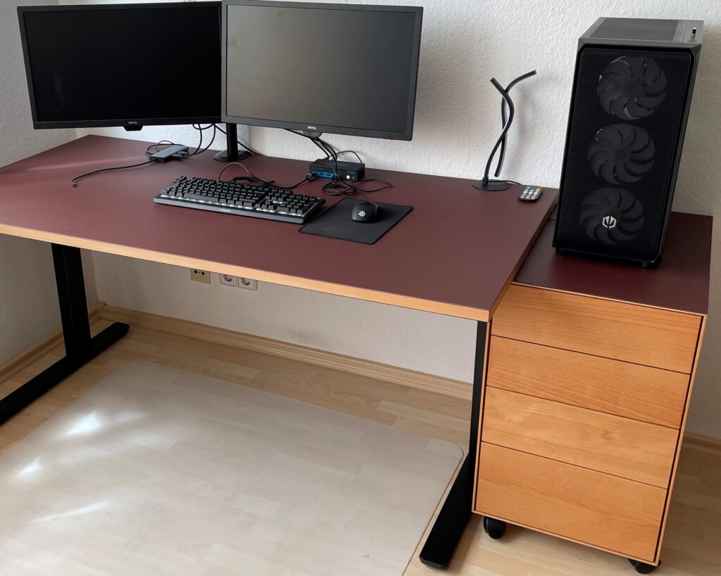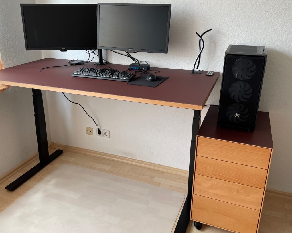 Höhenverstellbarer Schreibtisch aus Buche mit Linoleum belegt. Kleiner Rollcontainer mit Push to open Schubladen.