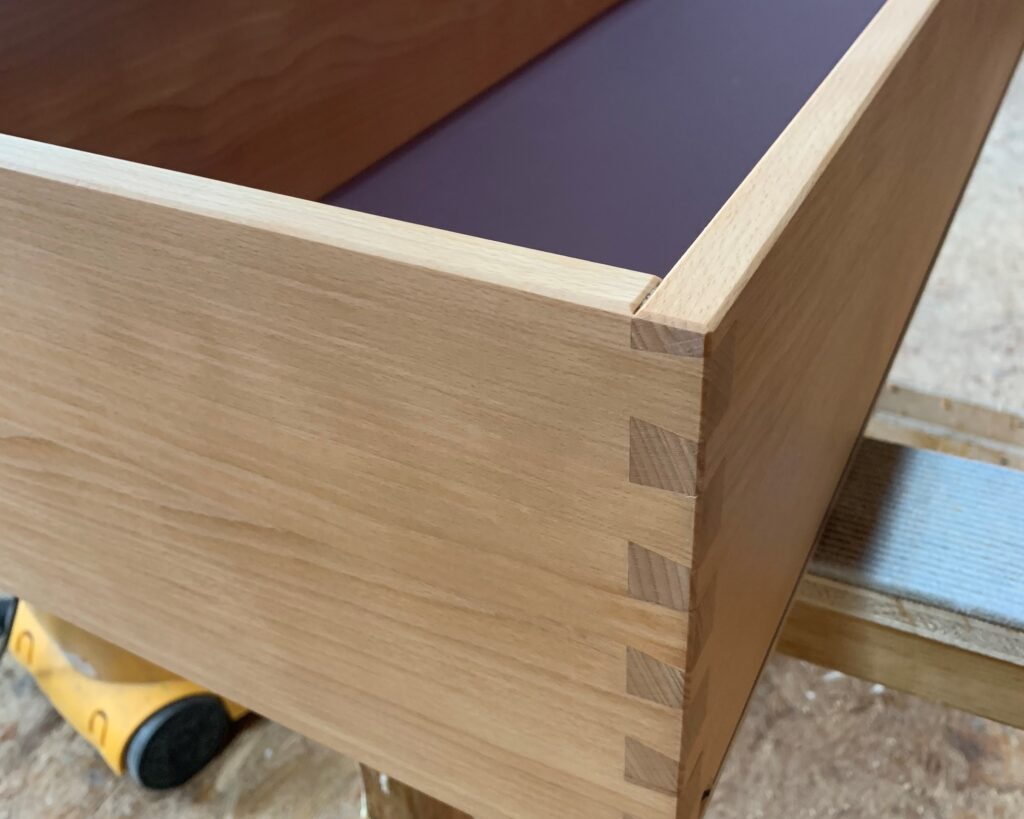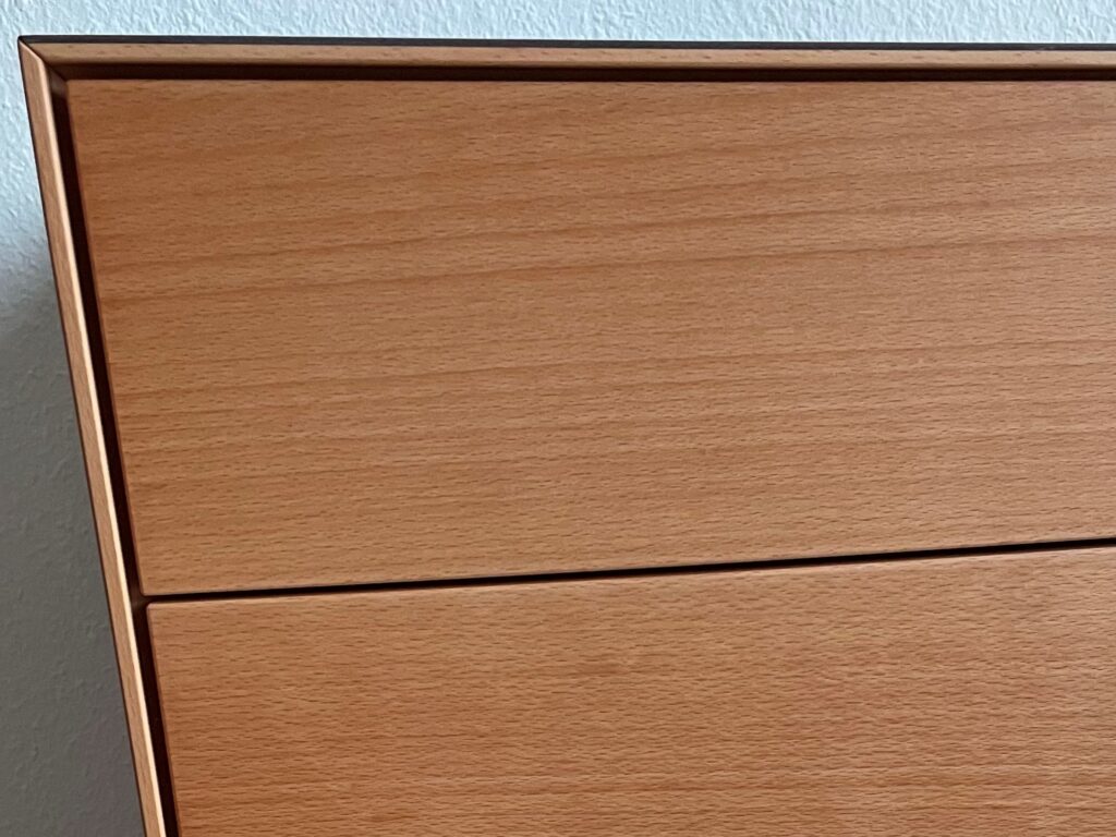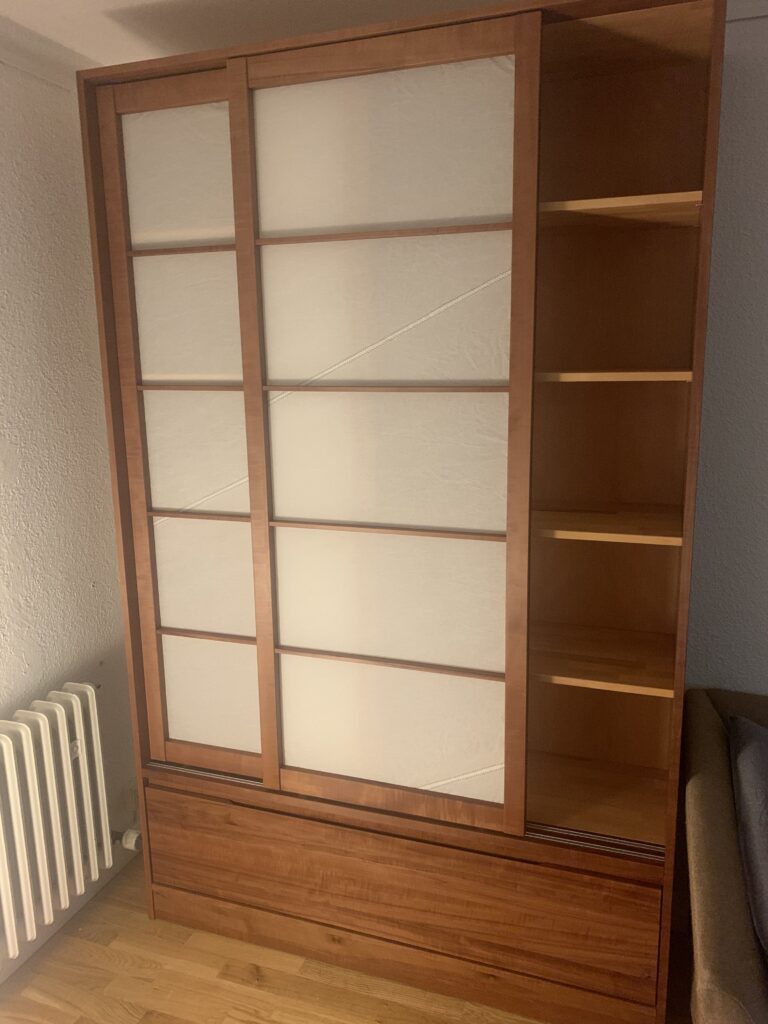 Büroschrank aus Elsbeere mit zwei Schiebetüren Shoji Art bespannt mit Segel anstelle von Reispapier. Eine große Schublade mit Schwalbenschwanzzinken.